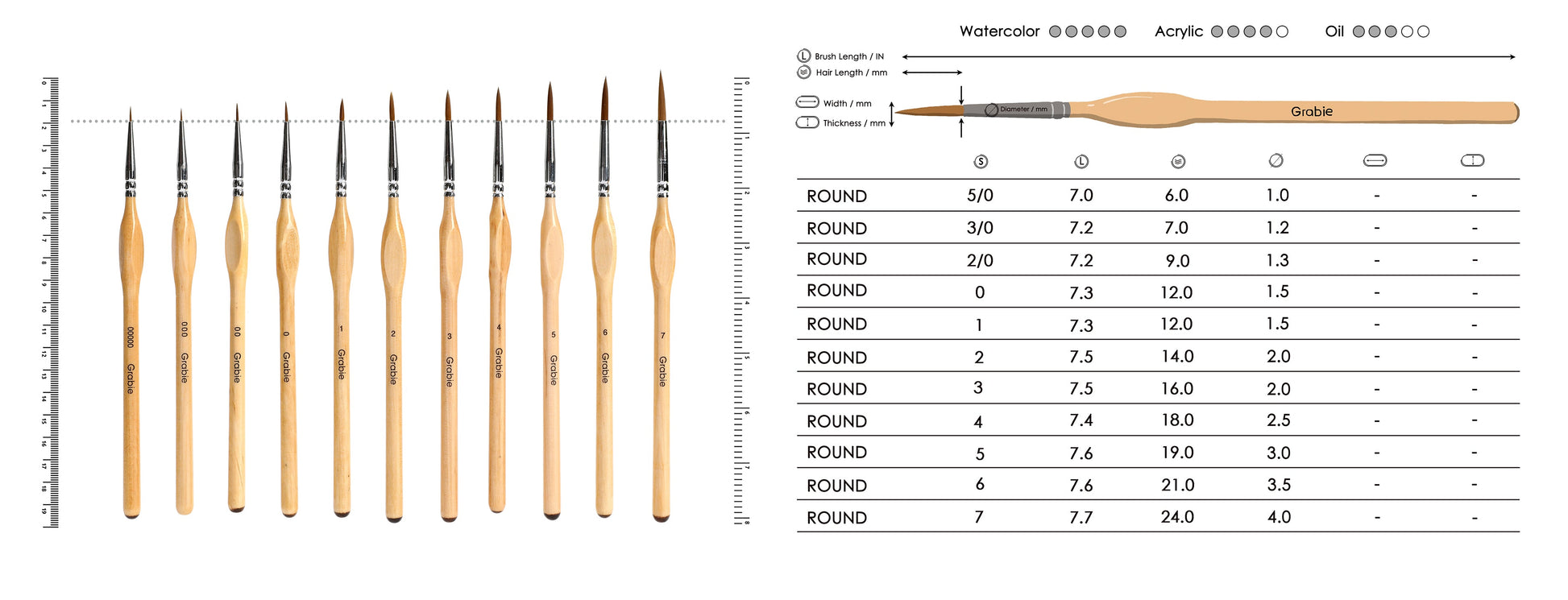 Deze lijn bevat een breed scala aan maten (rond 5/0, 3/0, 2/0, 0, 1, 2, 3, 4, 5, 6, 7) om te voorzien in de behoeften van elke schilder op het gebied van detailkwasten.