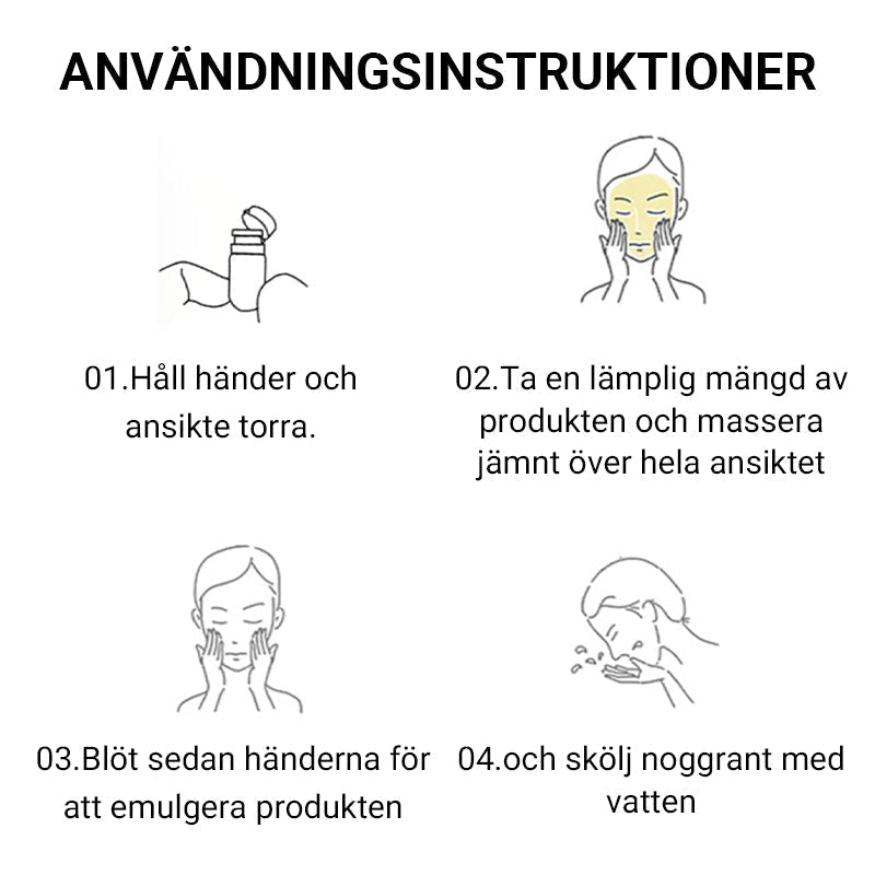 GEBRUIKSAANWIJZING: Houd handen en gezicht droog. Neem een geschikte hoeveelheid van het product en masseer gelijkmatig over het hele gezicht. Maak vervolgens je handen nat om het product te emulgeren en spoel grondig af met water.