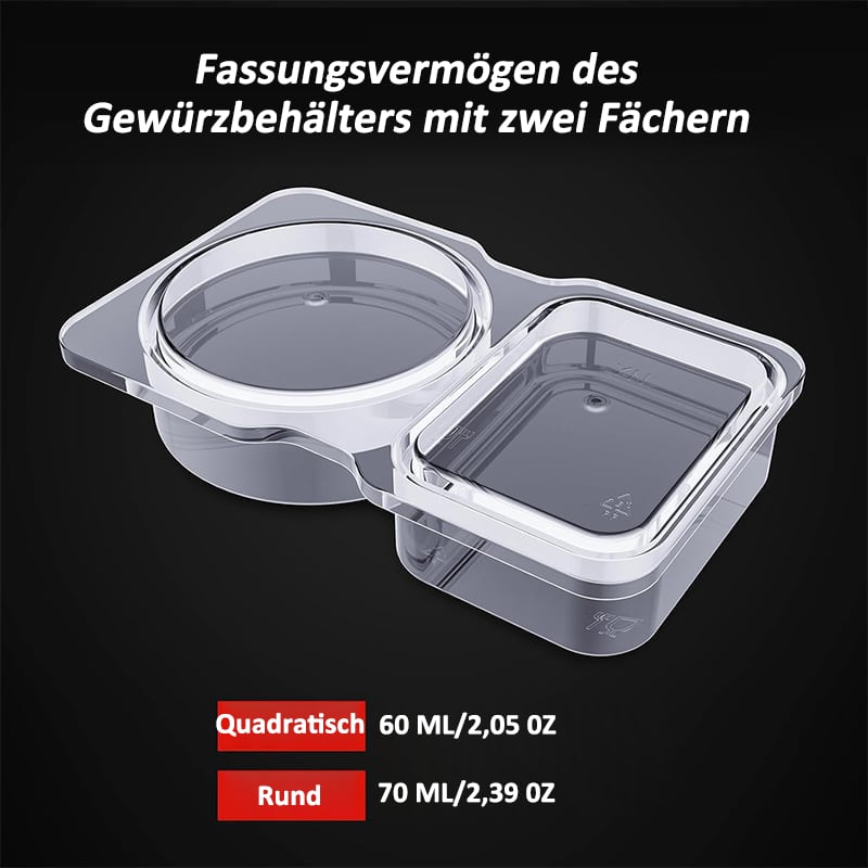 【Design met twee compartimenten】Deze kruidencontainer is uitgerust met 2 compartimenten waarin twee verschillende soorten voedsel tegelijk bewaard kunnen worden zonder dat je je zorgen hoeft te maken over het mengen van smaken, terwijl de originele smaak van de kruiden behouden blijft.