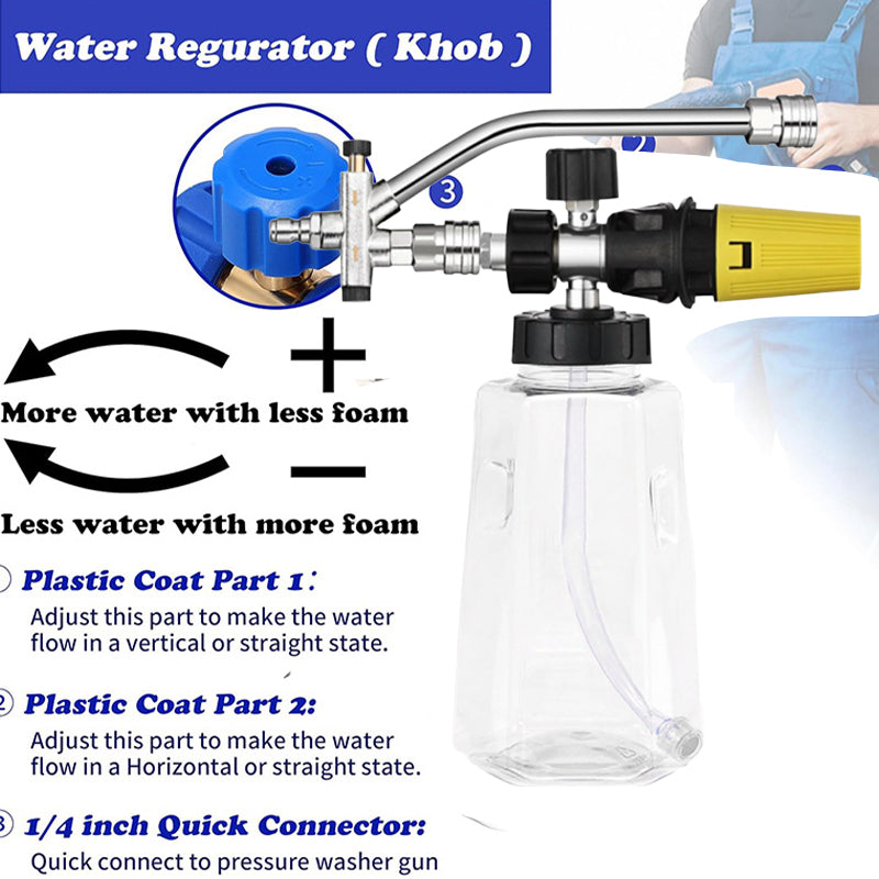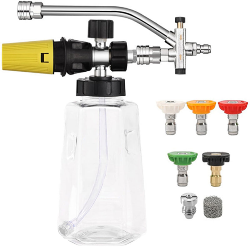 WIDE COMPATIBILITY & HIGH PRESSURE - Compatible with pressure washers ranging from 1000 psi to 3600 psi, this foam cannon features a 1-liter capacity container with a wide neck for easy filling and leak prevention. It is perfect for long-lasting use and handling large cleaning tasks, reducing the need for frequent refills.