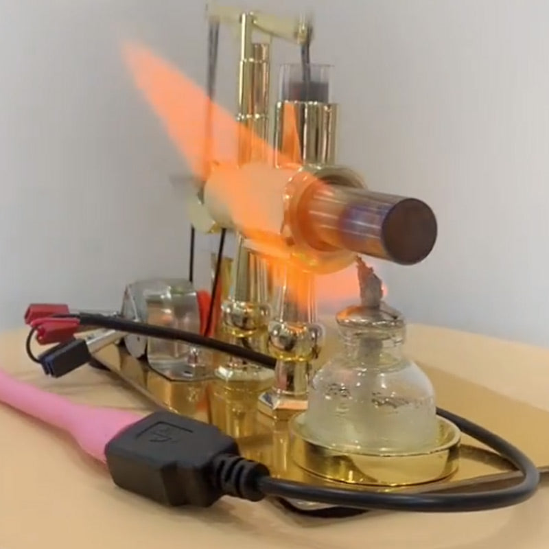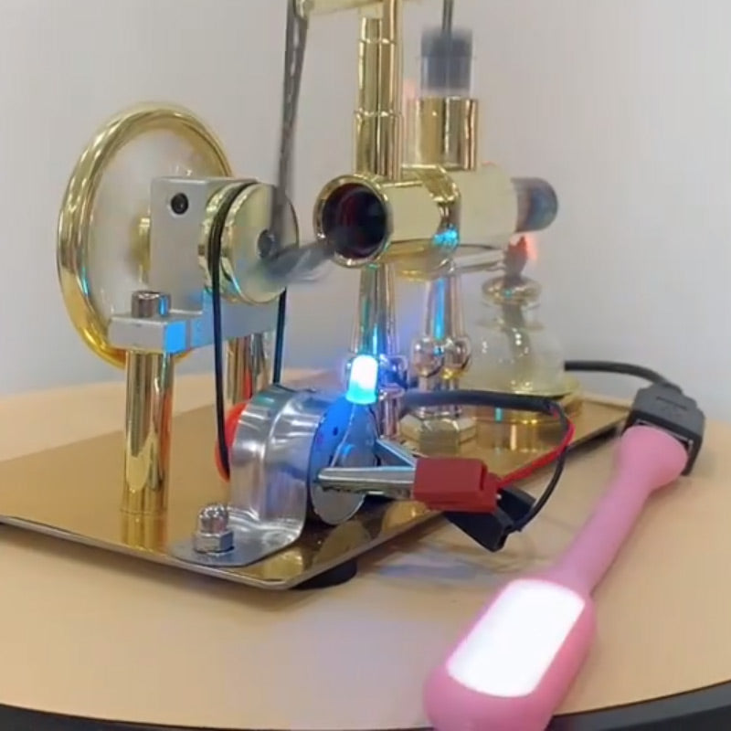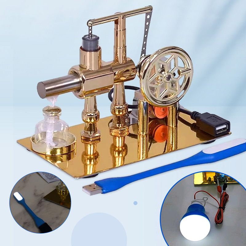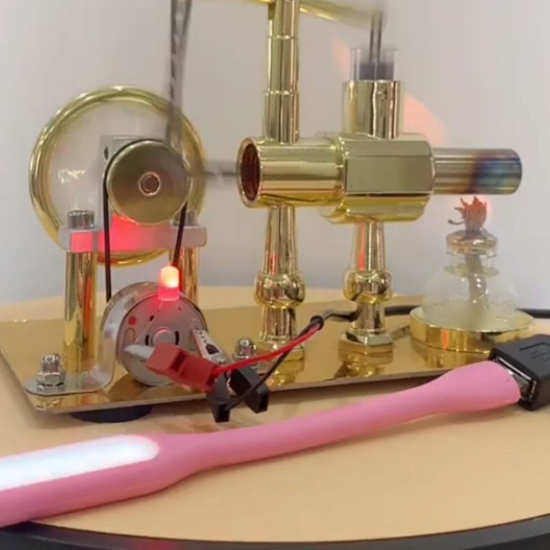 Laat een LED oplichten -- De Stirlingmotor is uitgerust met een USB LED. Verwarmd door de alcohollamp, draait de motor snel en continu en genereert elektriciteit om LED's of gloeilampen te laten branden, zodat je de charme van mechanische werking kunt voelen. Het is echt interessant en fantasierijk speelgoed.