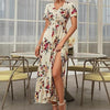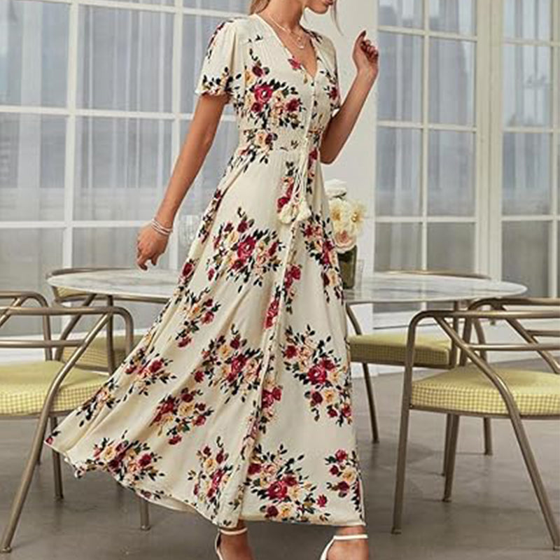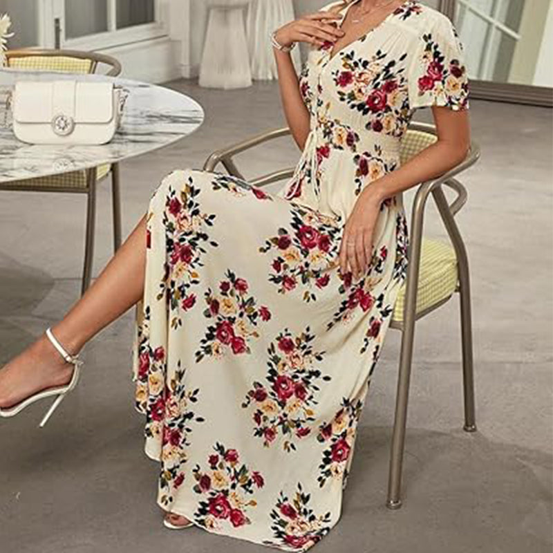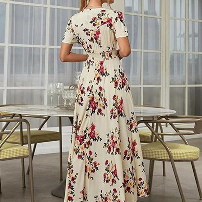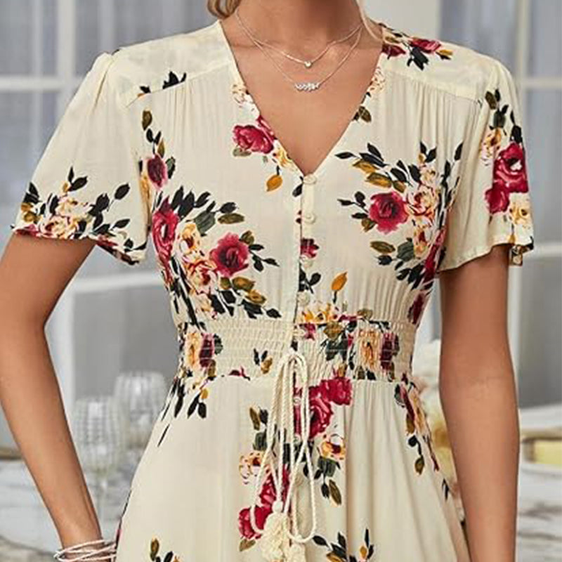 KORTE MOUWEN & V-NEK ONTWERP: De combinatie van korte mouwen en v-halslijn geeft een ontspannen maar elegante indruk, waardoor de jurk geschikt is voor verschillende gelegenheden, van casual bijeenkomsten tot meer formele evenementen.