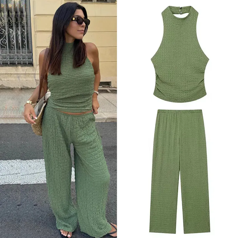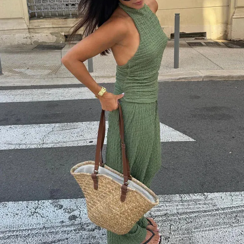 VRIJSTAAND MAAR ELEGANT: Deze set kan gemakkelijk worden getransformeerd van een casual outfit naar een iets elegantere outfit. Combineer het met sandalen of hakken en je hebt een veelzijdige look die geschikt is voor zowel casual als iets elegantere gelegenheden. De broek met wijde pijpen creëert een casual chique look, terwijl de rugloze top de outfit modern en vrouwelijk maakt.