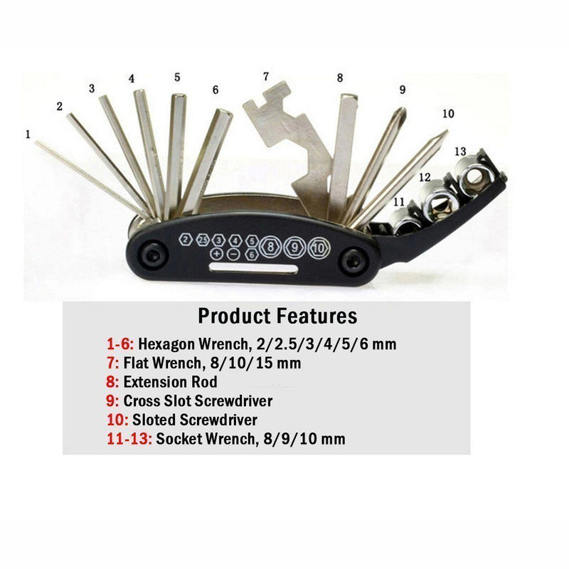 Slechts één multifunctionele schroevendraaier kan het probleem van het gebruik van schroeven en moeren oplossen. Uitgerust met een zeshoekige sleutel in meerdere maten, een dopsleutel in meerdere maten, een platte sleutel, een spaaksleutel voor het fietswiel en twee soorten schroevendraaiers, is het erg handig voor dagelijks onderhoud en installatie.