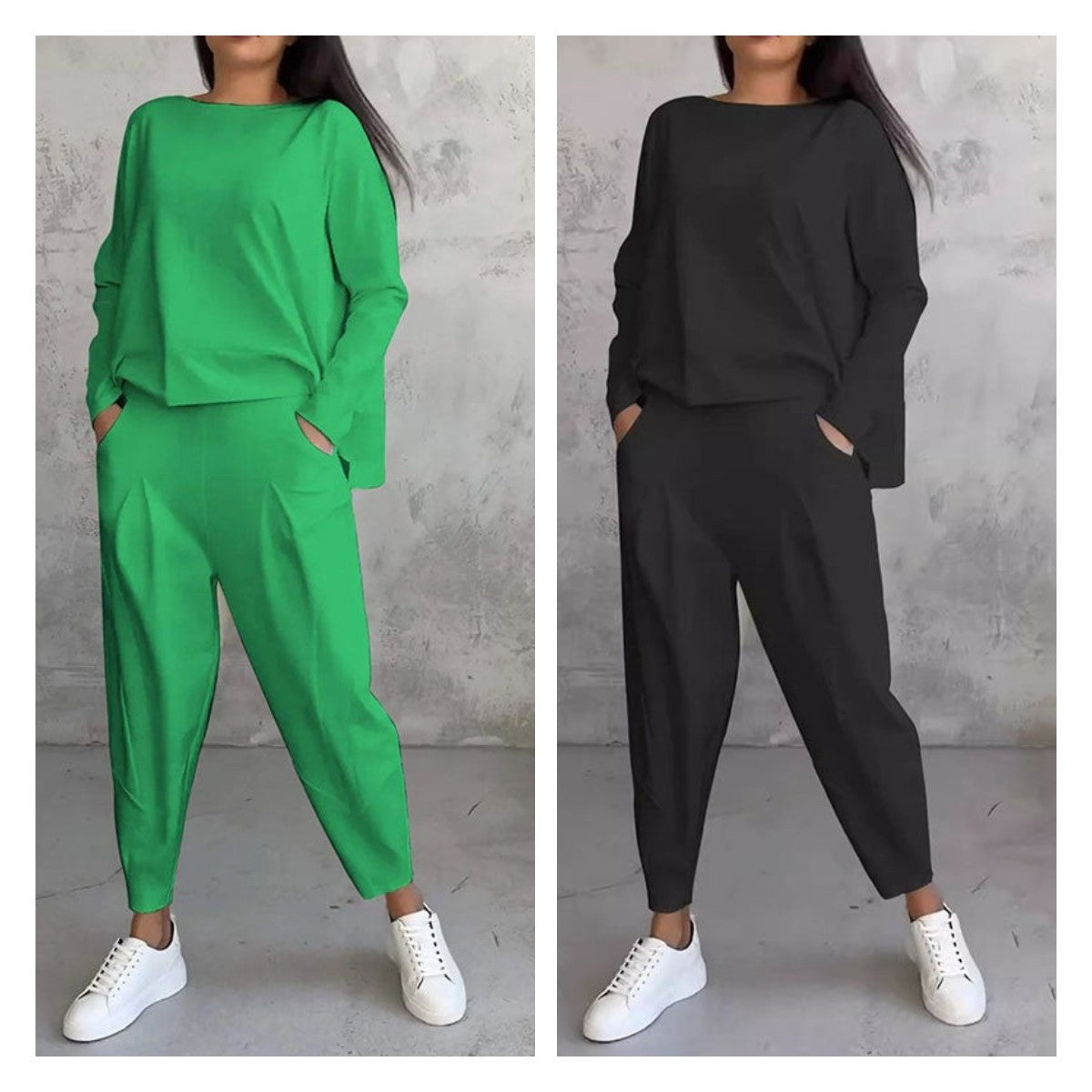 EFFEN KLEUR TOP EN BROEK: Deze stijlvolle set heeft een strak, effen ontwerp dat een vleugje elegantie toevoegt aan je dagelijkse kleding. De losse broek heeft een moderne twist en combineert comfort met eigentijdse stijl.