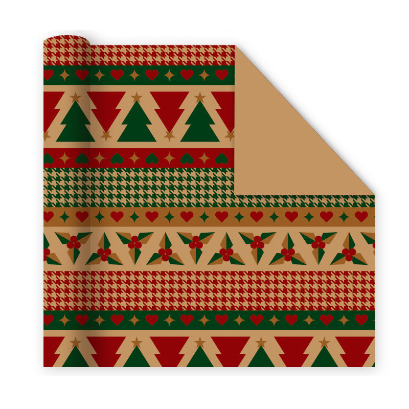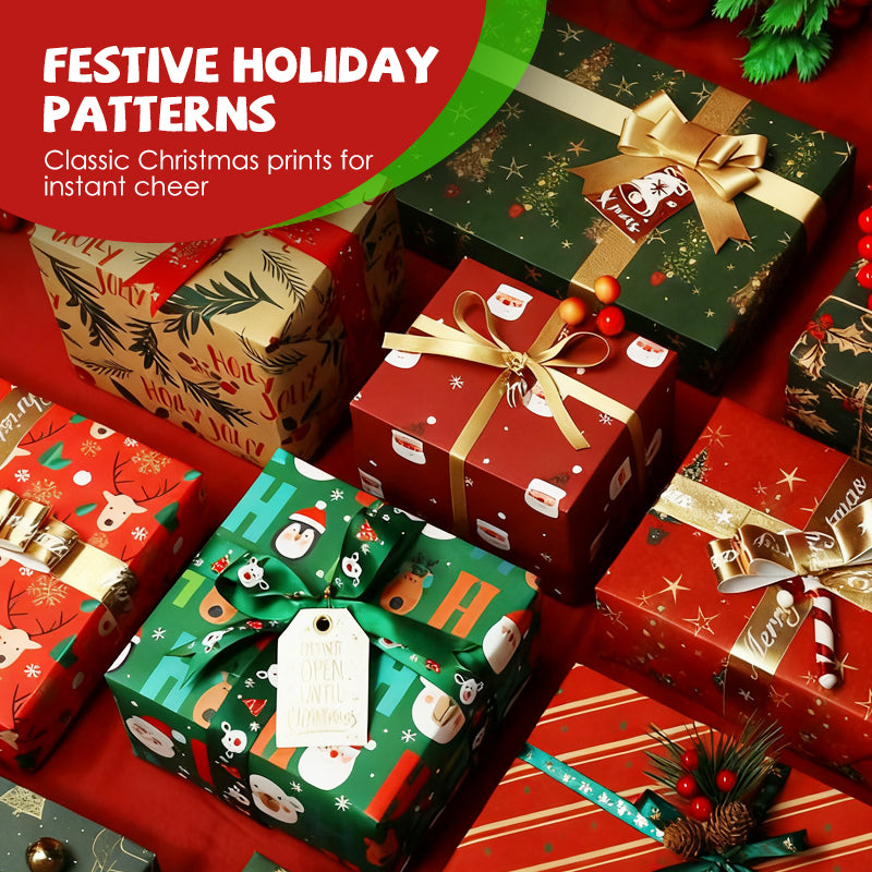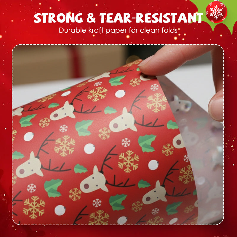 FESTIVE DESIGN THAT WOWS: Featuring classic holiday motifs like snowflakes, Christmas trees, and reindeer in rich red, green, and gold tones, this wrapping paper instantly elevates any gift.