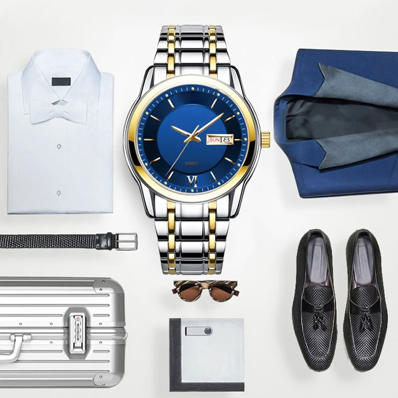 Klassiek herenhorloge - Dit ultradunne waterdichte kwartshorloge voor heren met dubbel kalendervenster heeft een klassiek zilver/goudkleurig horlogeontwerp, een spiegel van gecoat glas en een roestvrijstalen kast en band. De roestvrijstalen band maakt het horloge duurzaam en comfortabel om te dragen. Het horloge heeft ook een opvouwbare gesp voor maximaal comfort en veiligheid.