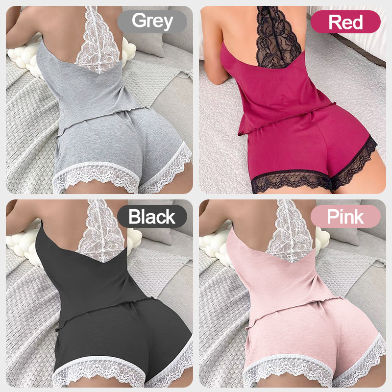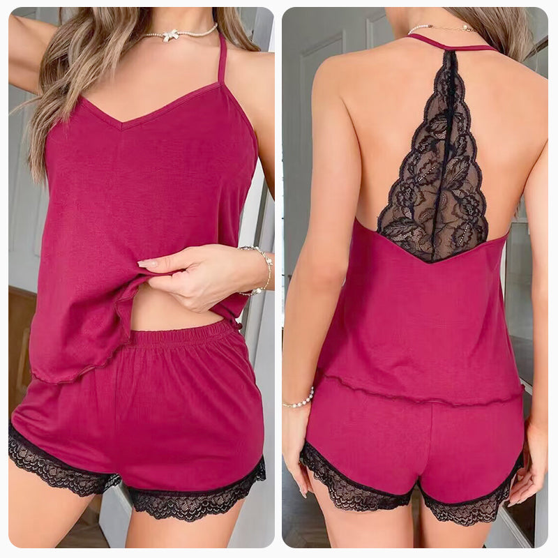 Sexy Lace Design - This sleepwear set features a sexy lace patchwork design on the back, which adds a touch of elegance and femininity to the overall look. The lace trim detailing on the shorts adds a touch of sophistication and class to the ensemble. The lace also adds a soft and luxurious feel to the fabric, making it perfect for a comfortable night's sleep.