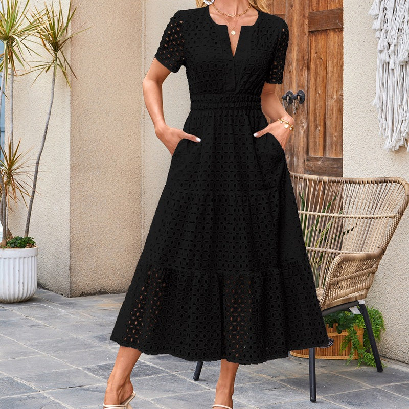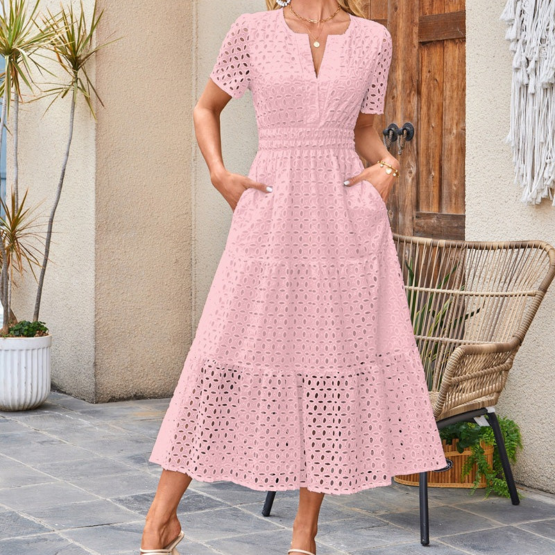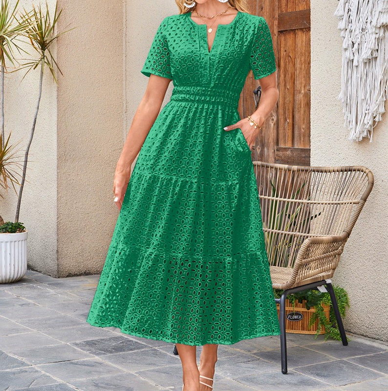 FIJNE OOGJESDETAILS - Ingewikkelde eyeletpatronen sieren de jurk en creëren een romantische en tijdloze esthetiek die perfect is voor elke gelegenheid.