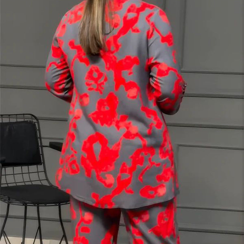 BOLD RED PRINT: De 2-delige outfit heeft een opvallende rode print op een grijze achtergrond, waardoor een levendig en opvallend contrast ontstaat dat je stijl versterkt.