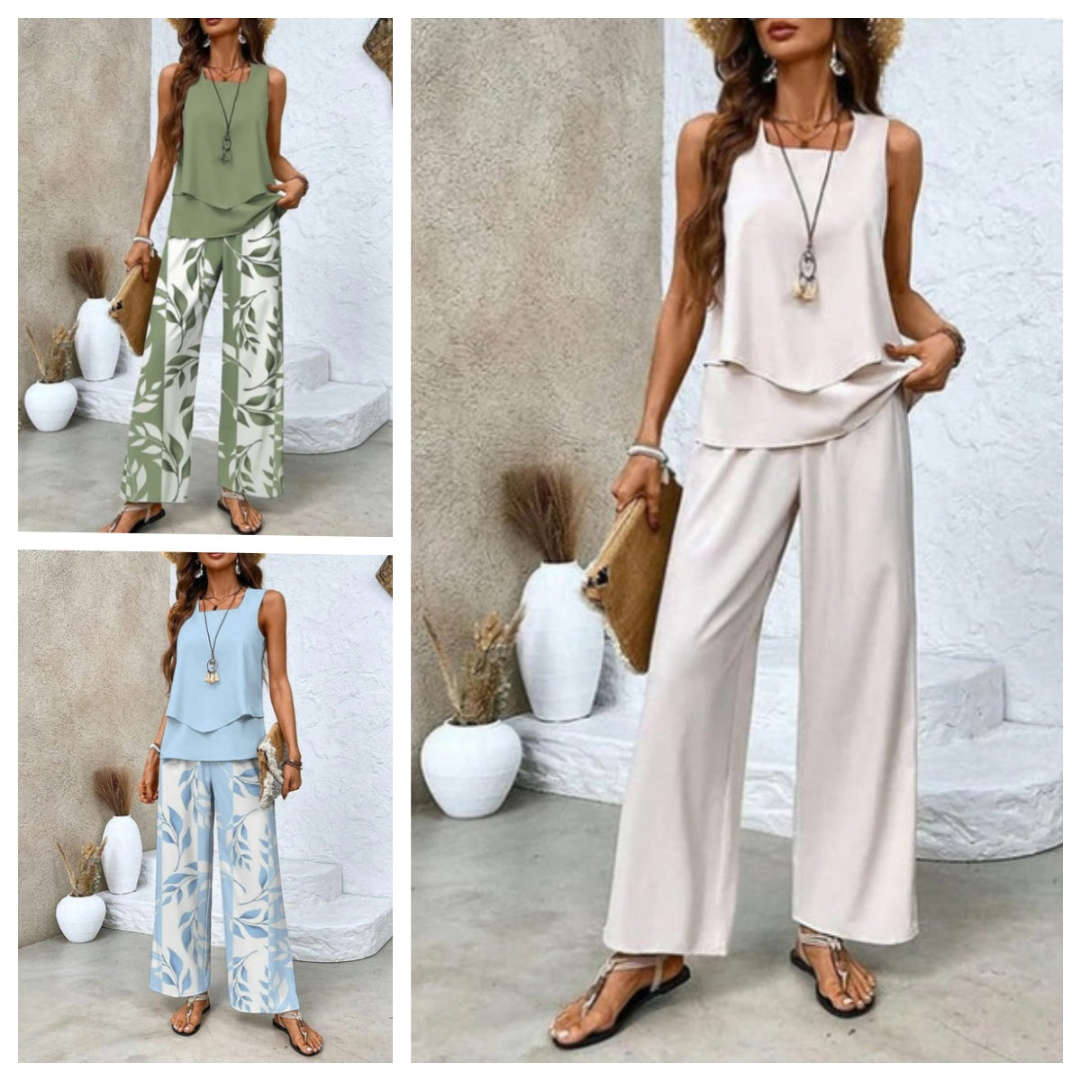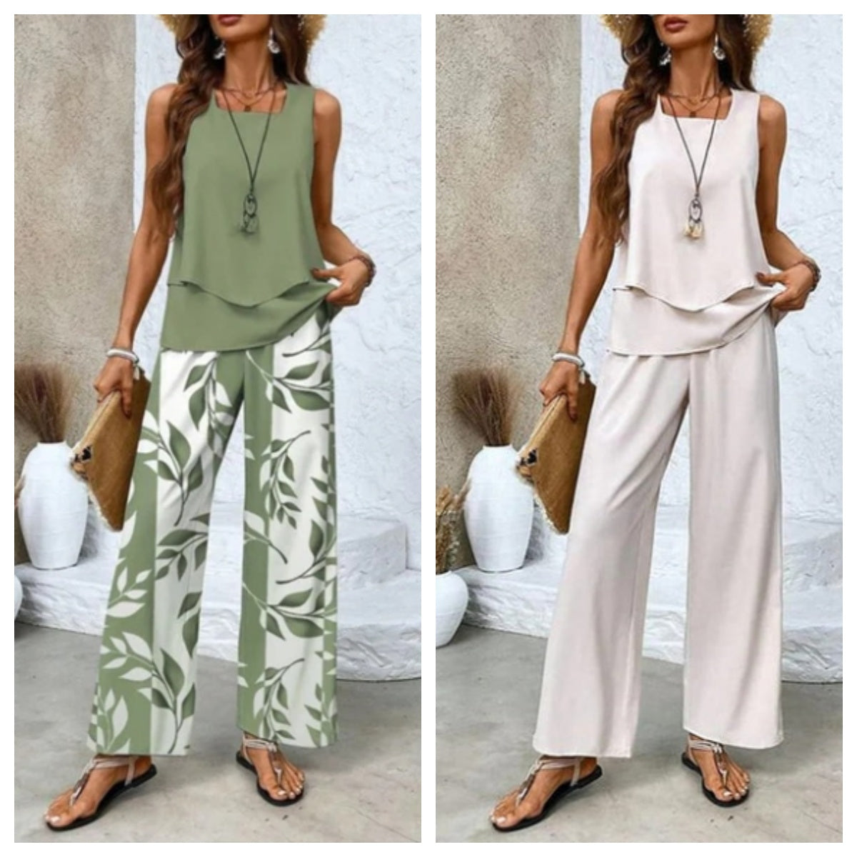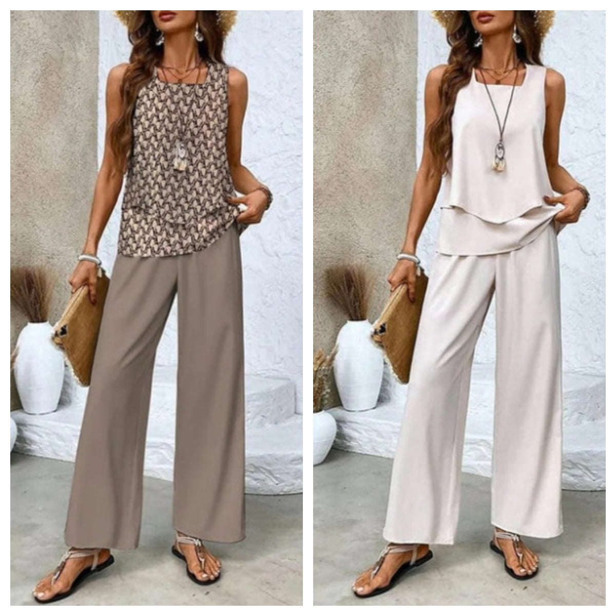 MODEONTWERP - Geniet van comfort en stijl gedurende de hele dag met deze 2-delige outfit, bestaande uit een mouwloze top en bijpassende broek, ontworpen voor een chique look die je van ochtend tot avond een goed gevoel geeft.