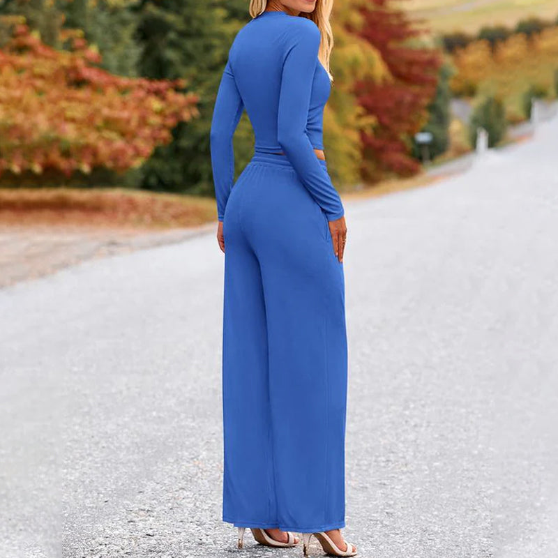 MODERNE GECOÖRDINEERDE LOOK – Deze tweedelige outfit bestaat uit een slim-fit top met lange mouwen en een wijde broek, waardoor een stijlvol silhouet ontstaat dat elegantie en gemak combineert voor een moeiteloos samengestelde, modieuze look.