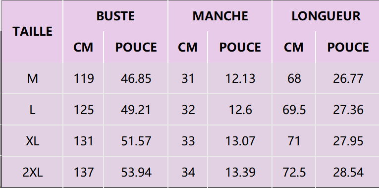 | GROOTTE (INCH) | BUST | SLEEVE | LENGTH |